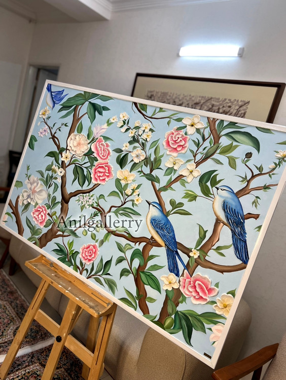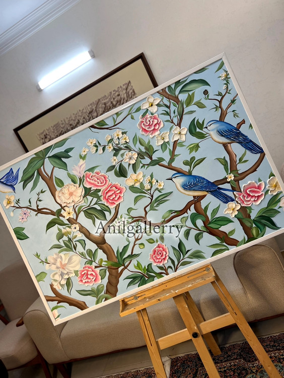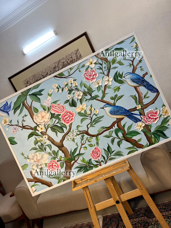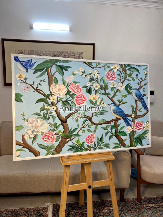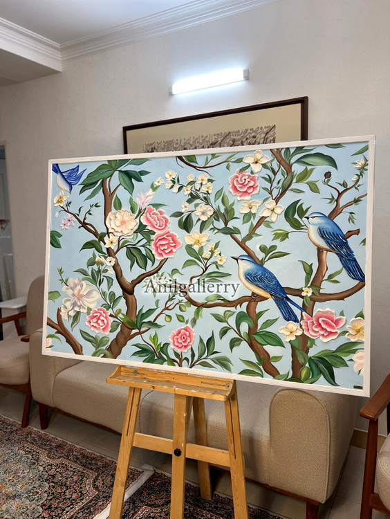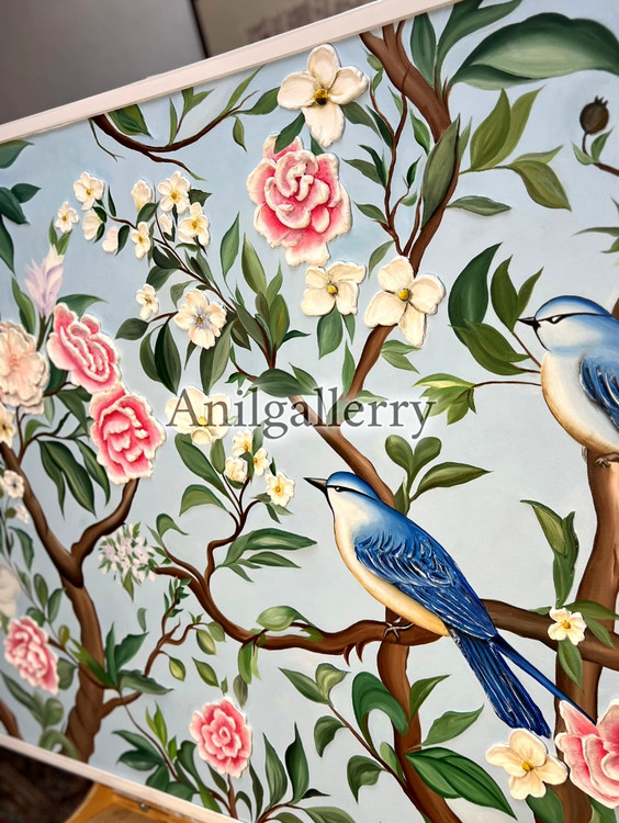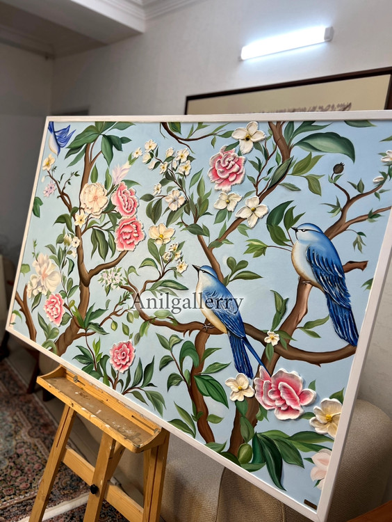 تابلو گل و بلبل تمام کار دست برجسته کار شده با رنگ روغن
