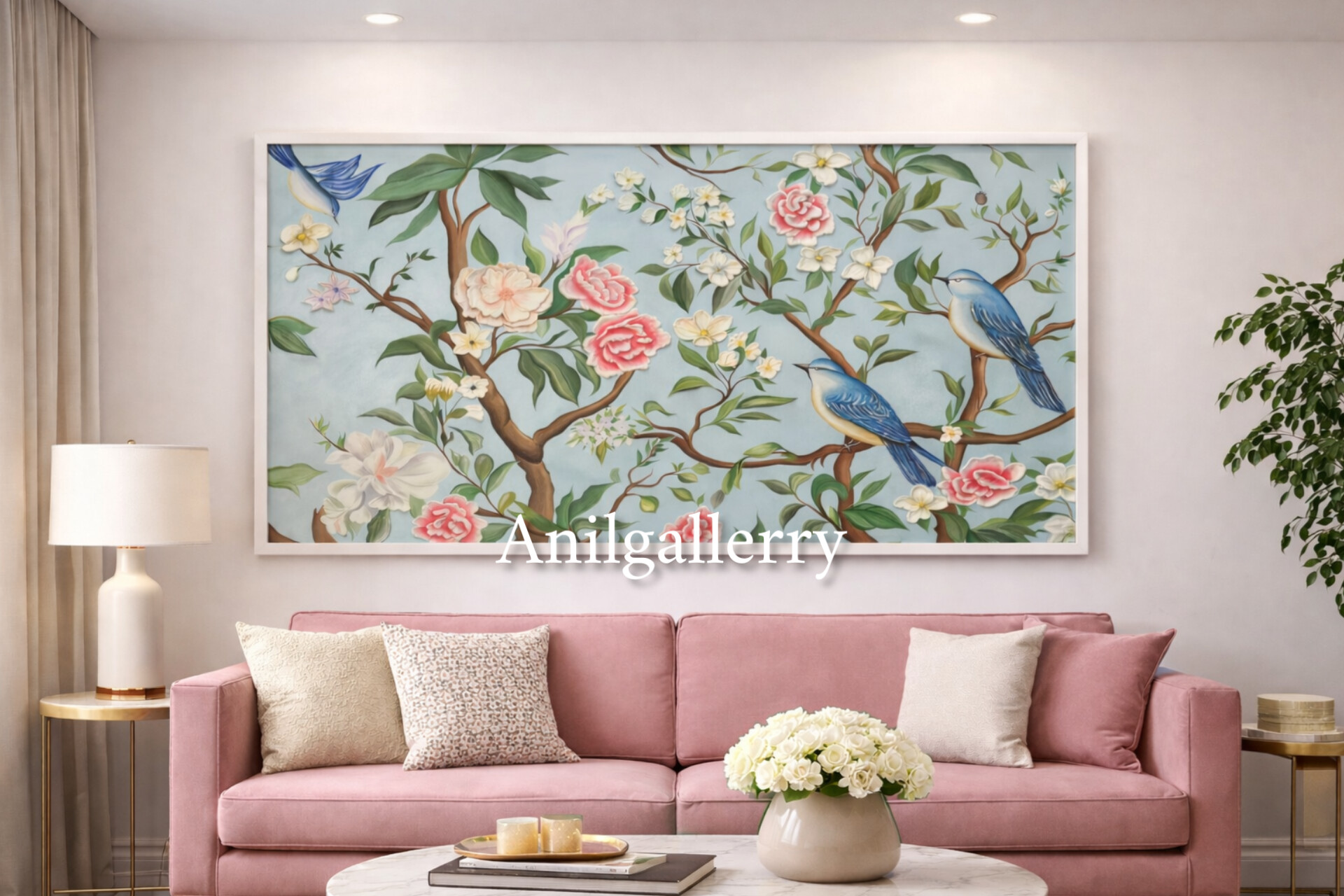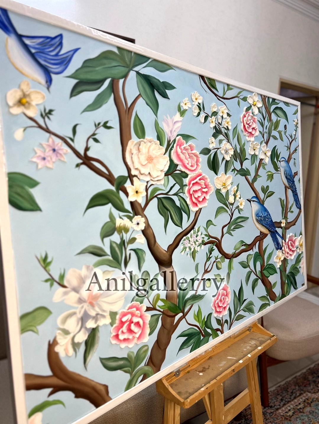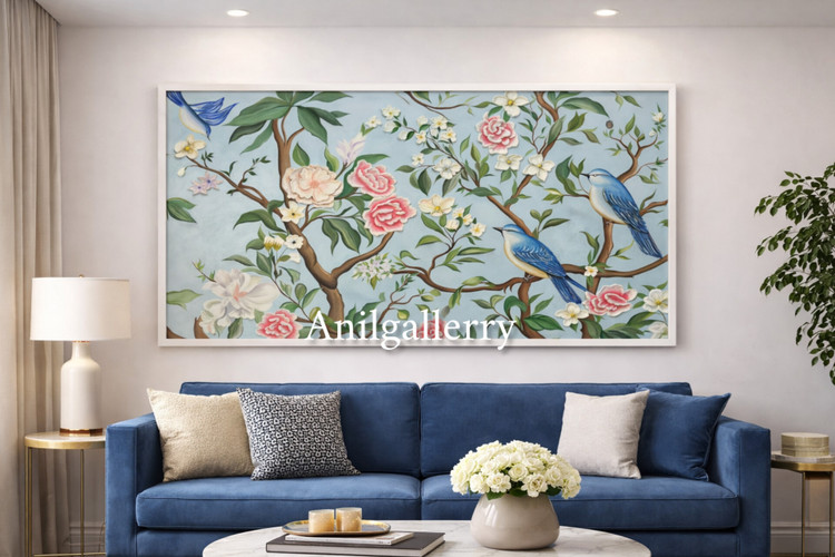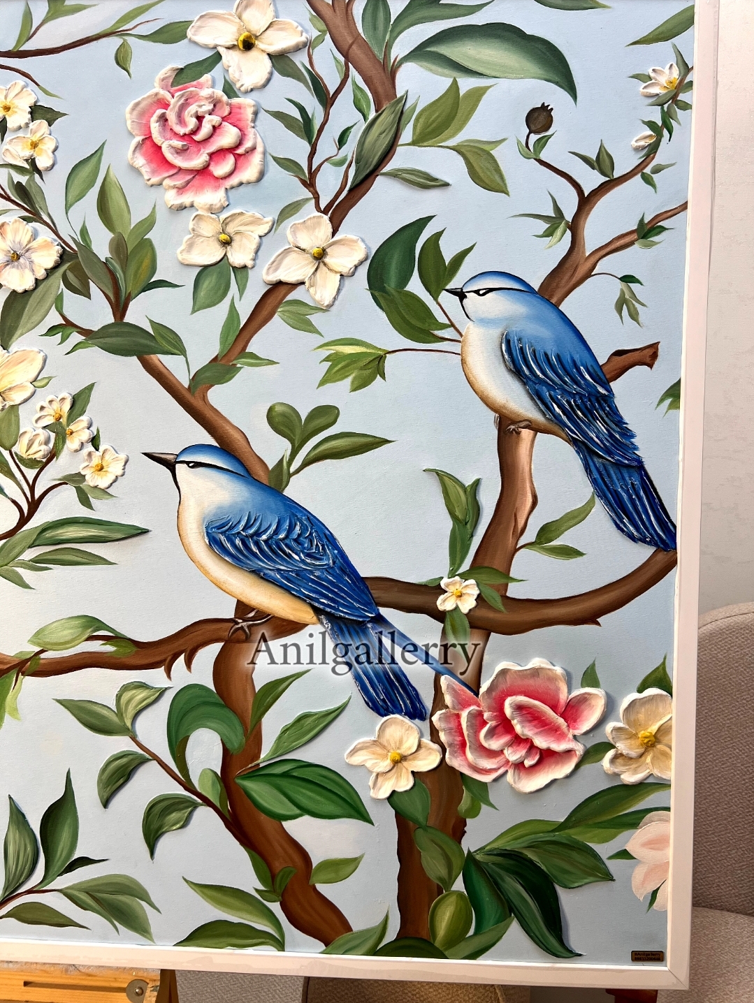 تابلو گل و بلبل تمام کار دست برجسته کار شده با رنگ روغن